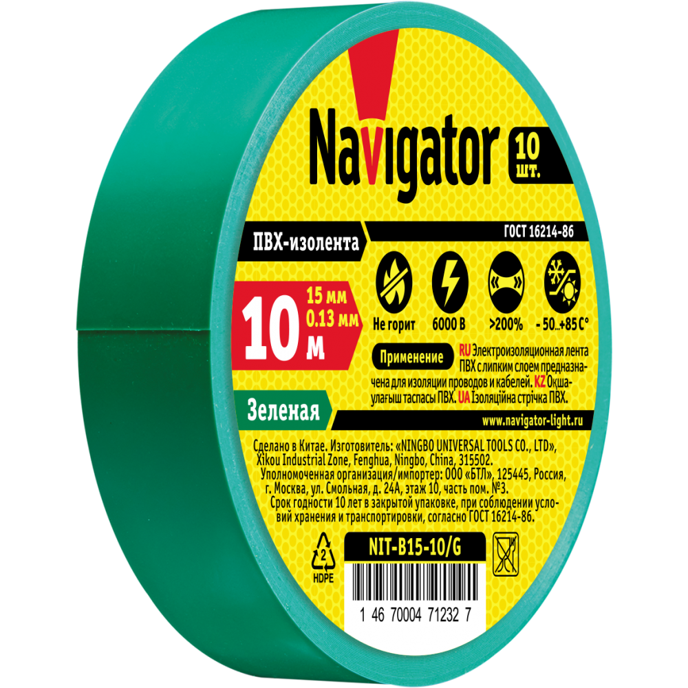 Изолента ПВХ 15мм (рул.10м) зел. NIT-B15-10/G Navigator 71232